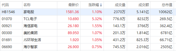 华盛资讯12月2日讯,家电股逆市普涨,其中,TCL电子大涨超5%,美的集团、海信家电、JS环球生活涨超1%,海尔智家涨近1%。消息面上,有机构称家电板块兼具价值和成长属性。