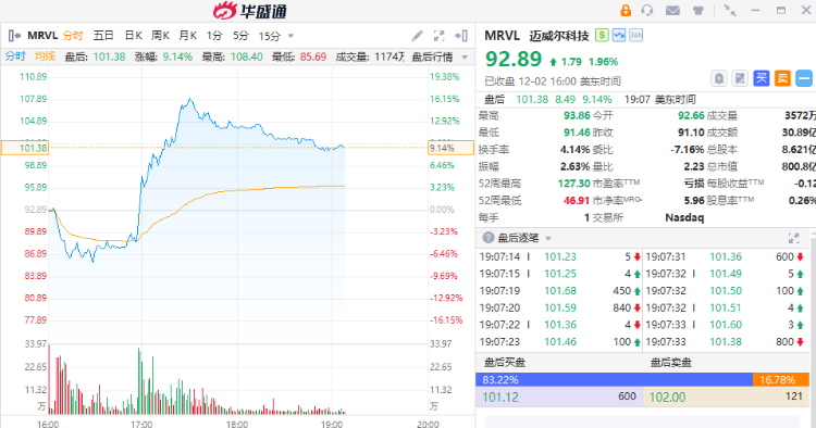 - 迈威尔科技盘后一度大涨16%,季报营收同比增长37%