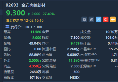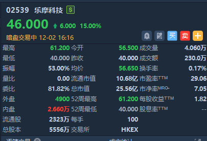 华盛资讯12月2日讯,港股金岩高岭新材、乐摩科技正在暗盘交易中。