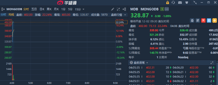 华盛资讯12月2日讯,AI应用软件股MongoDB盘前大涨超22%,公司2026财年Q3营收6.28亿美元,同比增长19%。