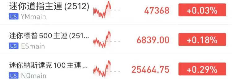 美股三大指数期货盘前上涨,纳指期货 $NQmain 涨0.29%,标普500期货 $ESmain 涨0.18%,道指期货 $YMmain 涨0.03%。