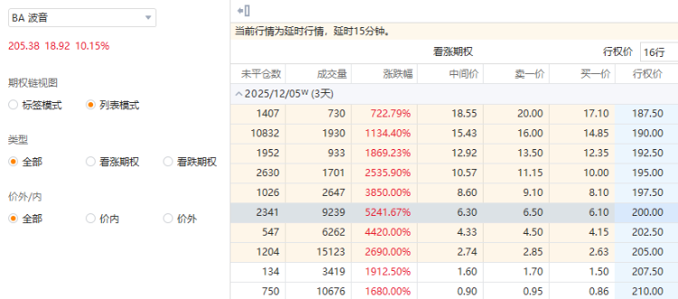 - 其中一看涨期权(BA_251205_C_200.00 )出现一笔异动大单,交易量逾9000张,该合约行权价为200美元,行权日在2025-12-05,该张期权涨5241.67%。