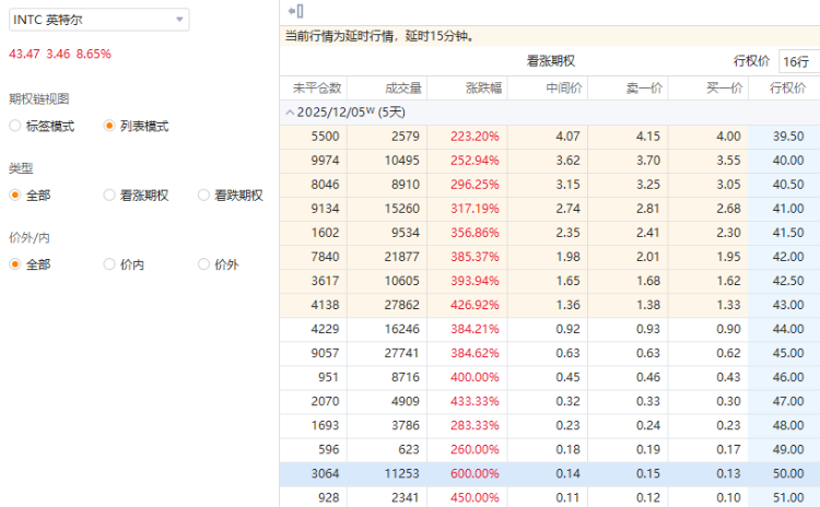 其中一看涨期权(INTC_251205_C_50.00 )出现一笔异动大单,交易量逾1万张,该合约行权价为50美元,行权日在2025-12-05,该张期权涨600%。