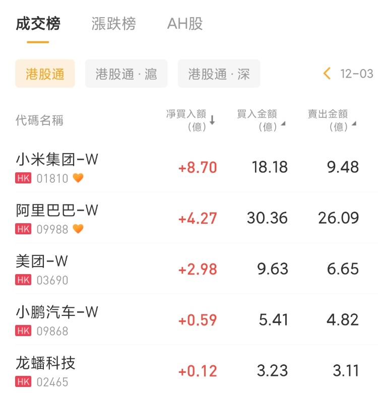 小米集团-W 、阿里巴巴-W、美团-W分别获净买入8.7亿港元、4.27亿港元、2.98亿港元;