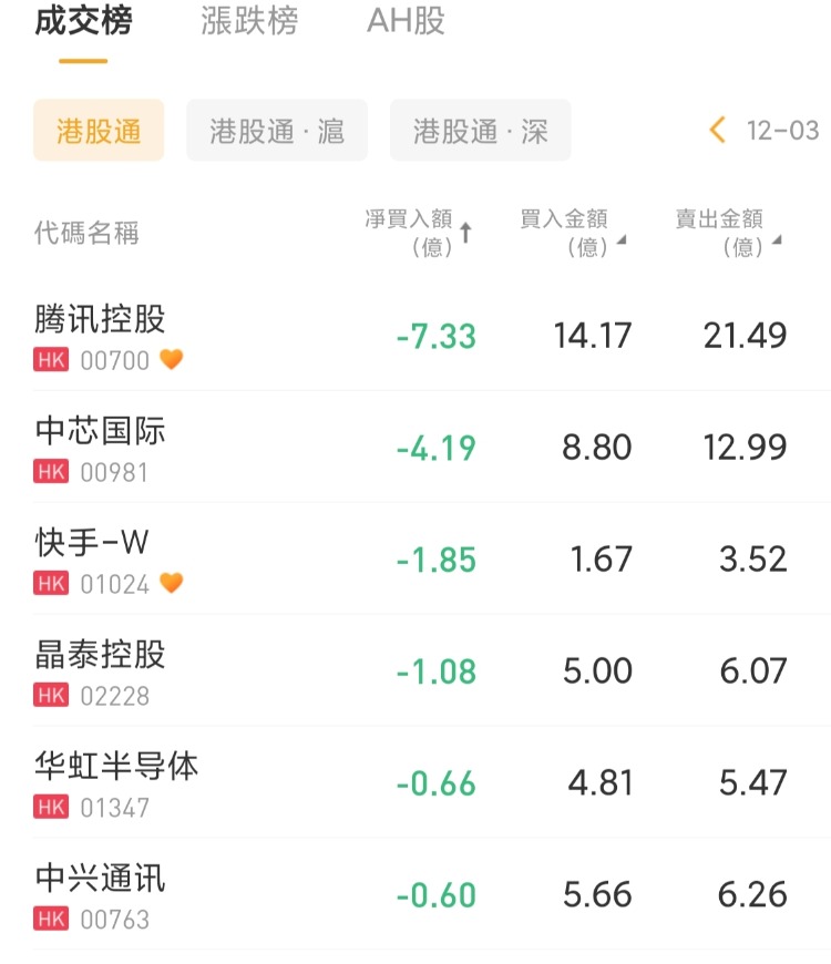 腾讯控股、中芯国际、快手-W分别遭净卖出7.33亿港元、4.19亿港元、1.85亿港元。