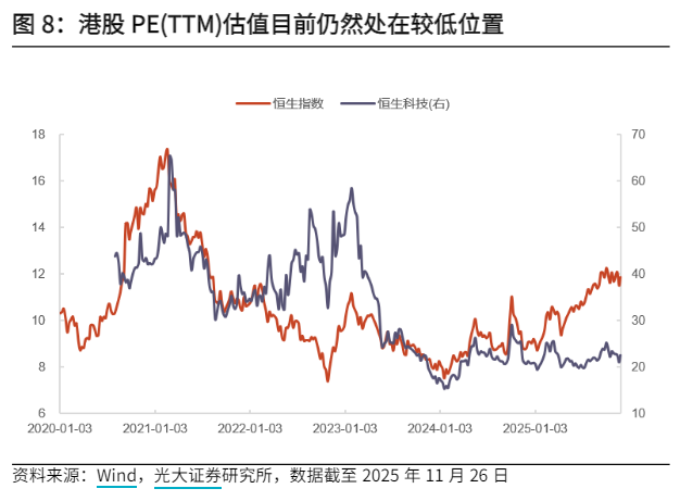光大证券表示,美联储12月有望降息,港股未来或继续震荡上行。港股整体盈利能力相对较强,同时互联网、新消费、创新药等资产相对稀缺。此外,尽管港股已经连续多月上涨,但是整体估值仍然偏低,恒指为11.84倍,科指为22.47倍,长期配置性价比仍较高。在AI产业趋势持续发展,以及美联储12月有望降息的背景下,港股市场未来或许将继续震荡上行。