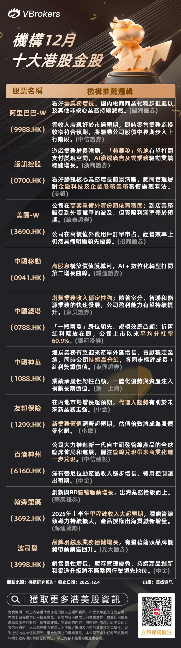 一图看懂:12月港股金股及机构推荐逻辑