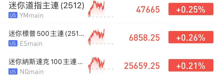 美股三大指数期货盘前上涨,纳指期货 $NQmain 涨0.21%,标普500期货 $ESmain 涨0.26%,道指期货 $YMmain 涨0.25%。