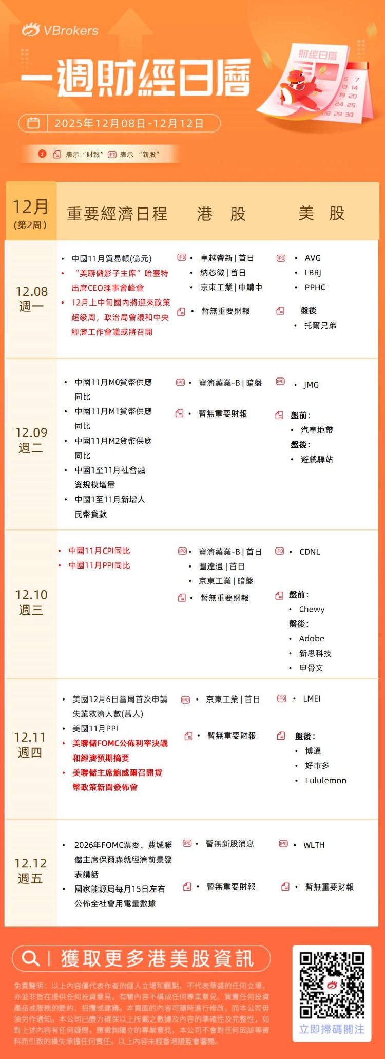 编者按:重磅预警!美联储利率决议来袭,或再降息25个基点;中国11月CPI、PPI重磅出炉!甲骨文、博通、等美股将发财报;京东工业、卓越睿新下周上市。