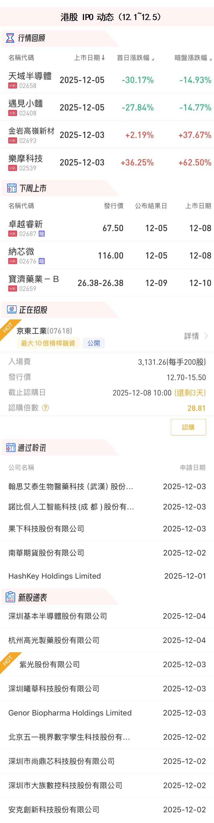 华盛资讯12月5日消息,年末港股IPO市场热度回暖,本周“京东系”第六家上市公司京东工业正在招股中;4只新股于本周上市,其中乐摩科技首日大涨36%;此外,纳芯微、卓越睿新本周完成招股,将于下周一上市。
