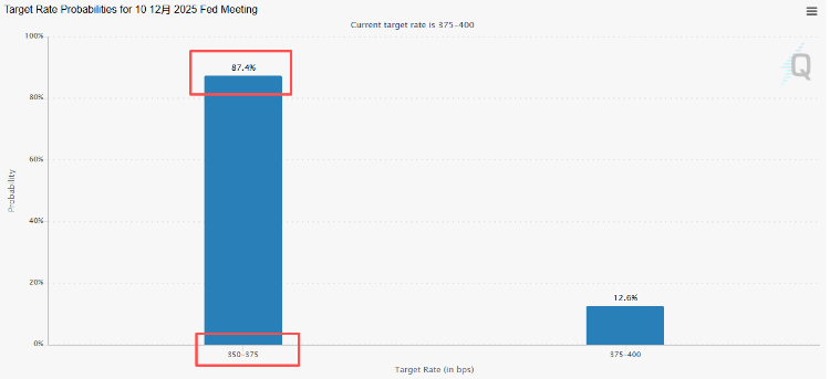 最新数据显示,市场预测美联储12月会议降息押注已板上钉钉,根据芝商所美联储观察工具(CME FedWatch Tool)的数据,联邦基金利率本周降低25个基点至3.5%-3.75%的概率约为87%。