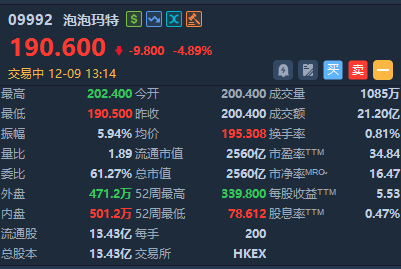华盛资讯12月9日讯,新消费概念股延续跌势,截至发稿,泡泡玛特跌近5%,布鲁可跌超4%,老铺黄金跌超3%,蜜雪集团、古茗、名创优品跌超1%。