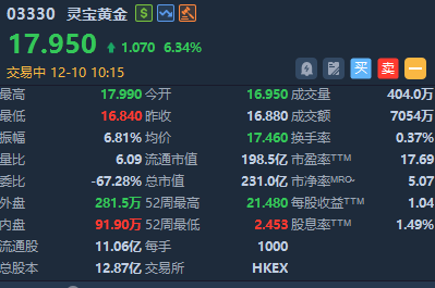华盛资讯12月10日讯,黄金股逆势走高,截至发稿,灵宝黄金涨超6%,老铺黄金、紫金黄金国际涨超 3%,招金矿业、赤峰黄金涨超1%。