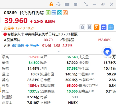 华盛资讯12月10日讯,长飞光纤光缆快速拉升,大涨超5%,盘初一度大跌逾6%,随后强势冲高,截至发稿,涨5.38%,报39.96港元,成交额超13亿港元。