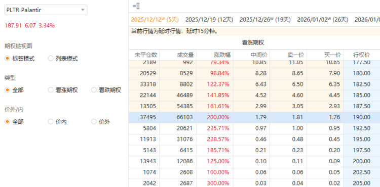 其中一看涨期权(PLTR_251212_C_190.0)交易量达6.61万张,该合约行权价为190.0美元,行权日在2025-12-12,该张期权涨200.0%。