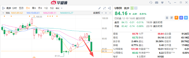 4、优步:隔夜跌5.51%,收盘价报84.16美元。