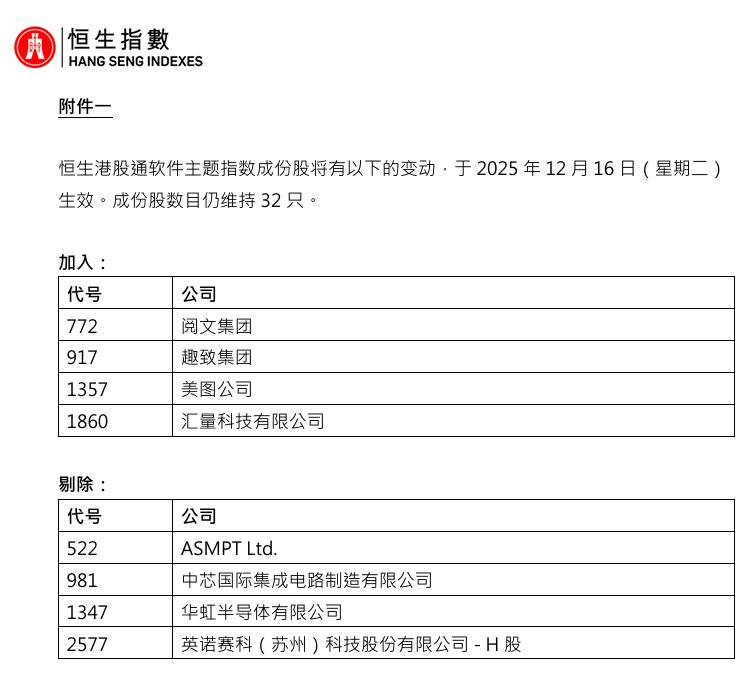 恒生港股通软件及半导体(可投资)指数将改名为恒生港股通软件主题指数。加入阅文集团、趣致集团、美图、汇量科技四只股份,剔除ASMPT、中芯国际、华虹半导体、英诺赛科四只股票,于2025年12月16日(星期二)生效。