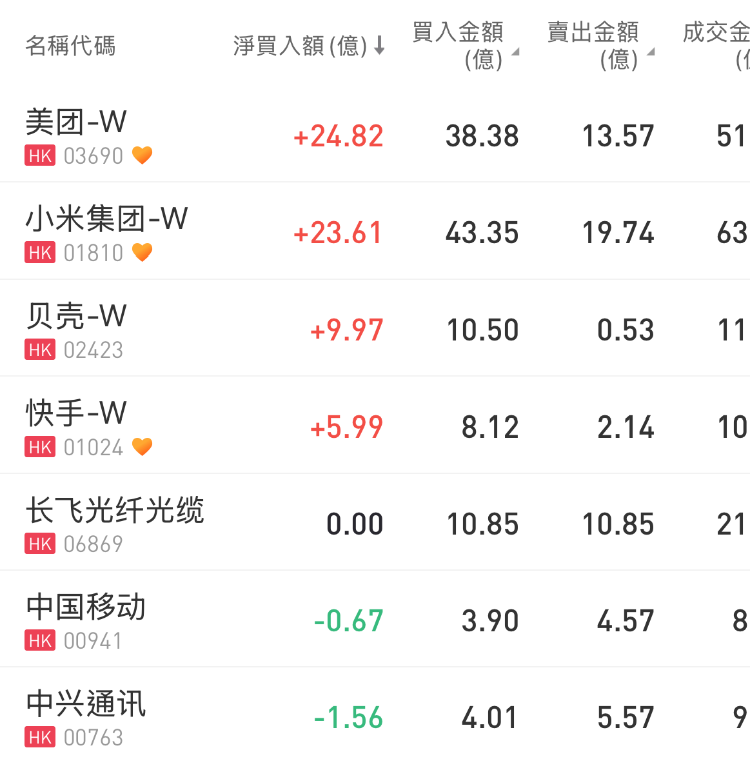 美团-W、小米集团-W、贝壳-W分别获净买入24.82亿港元、23.61亿港元、9.97亿港元;