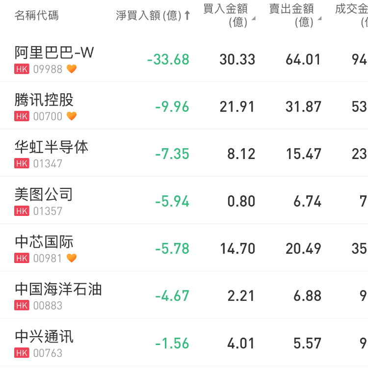 阿里巴巴-W、腾讯控股、华虹半导体遭净卖出33.68亿港元、9.96亿港元、7.35亿港元。
