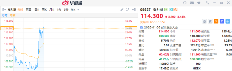 华盛资讯12月16日讯,港股赛力斯短线拉升,涨超3%,报113.8港元;A股涨超4%,报人民币124.88元。