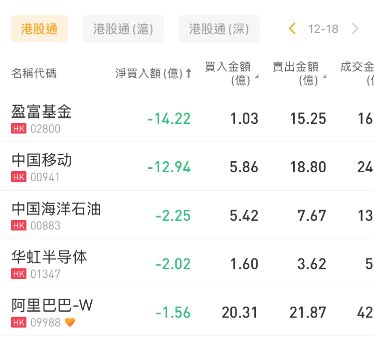 盈富基金、中国移动、中国海洋石油遭净卖出14.22亿港元、12.94亿港元、2.25亿港元。