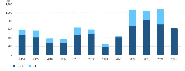 2025年,全球央行购金行为已从“趋势”升级为“战略”。今年前三季度的全球央行累计购金量已达到634吨。中国央行已连续增持13个月,波兰、巴西、印度等新兴市场央行也在持续加大购买力度。波兰国家银行甚至在10月单月增持16吨黄金,将其储备占比推高至26%。