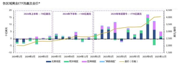 另外,ETF资金的大举涌入也成为金价抬升的另一动力。截至11月30日,2025年黄金ETF流入超770亿美元,以至今年全球黄金ETF流入总量有望创下历史最佳年度表现。