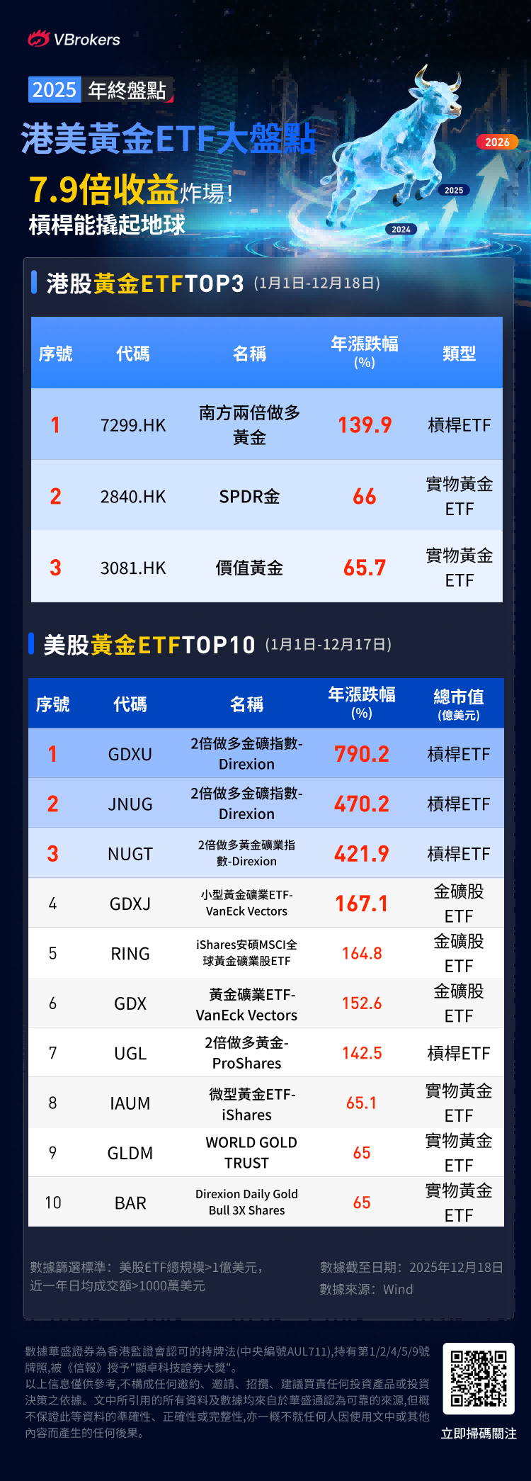 黄金ETF也是投资黄金的另一种方式。港股市场上,黄金ETF种类较少,其中南方两倍做多黄金的杠杆ETF录得近140%涨幅;美股市场上黄金相关ETF较多,整体来看收益排序:杠杆金矿股ETF>金矿股ETF>杠杆现货黄金ETF>实物黄金ETF,弹性最大的美股市场TOP1 是三倍做多黄金矿业ETF,涨幅高达790.2%。