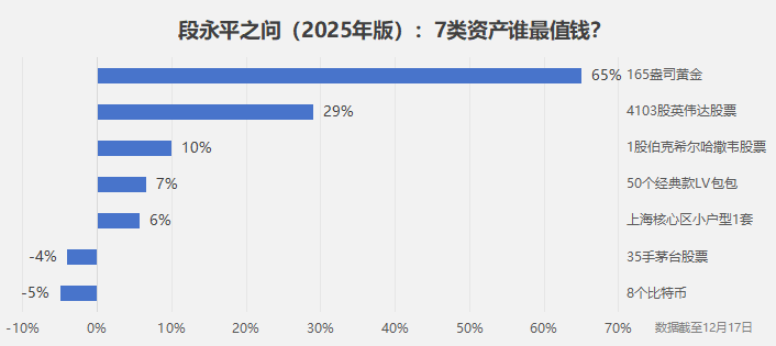 投资大佬段永平曾发出灵魂拷问,手握500万资金,5年后以下哪类资产最值钱?假设我们缩小时间维度,站在2025年初,年终发现黄金的收益可谓“一枝独秀”。