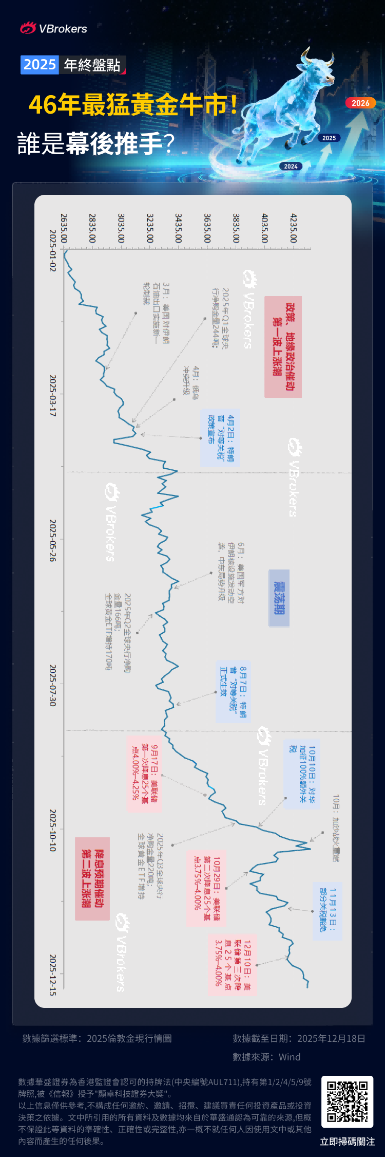 2025年,美联储在9月、10月和12月连续三次降息,累计下调利率75个基点。降息直接压低了持有黄金(不生息资产)的“机会成本”。特别是在9月首次降息落地后,金价应声大涨18%,直接冲上10月末的历史新高。