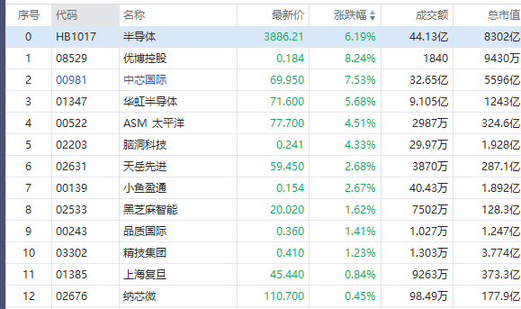 华盛资讯12月22日讯,港股半导体与光通信股持续拉升,中芯国际涨近8%,华虹半导体涨近6%,ASM 太平洋涨超4%,黑芝麻智能、上海复旦跟涨。