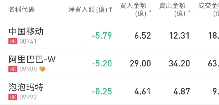 中国移动、阿里巴巴-W、泡泡玛特分别遭净卖出5.79亿港元、5.2亿港元、2,545万港元。