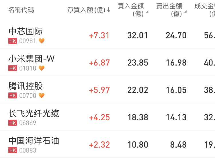 中芯国际、小米集团-W 、腾讯控股分别获净买入7.31亿港元、6.87亿港元、5.97亿港元;