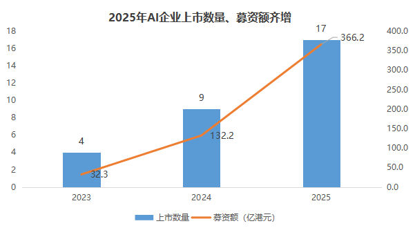 其实,相比于前两年,今年上市的AI企业明显增多,据华盛资讯统计,截至12月23日,已有约17家AI企业成功上市,比去年激增超七成;募资额总计约366.2亿港元,同比暴增177%,占港股全年IPO总募资的13%以上。