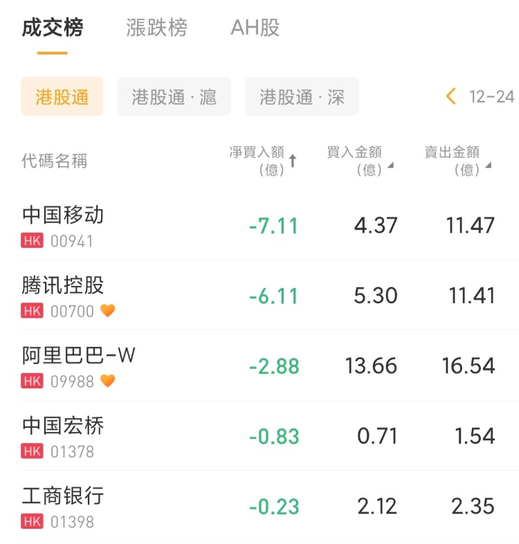 中国移动、腾讯控股、阿里巴巴-W分别遭净卖出7.11亿港元、6.11亿港元、2.88亿港元。