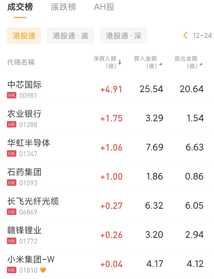 中芯国际、农业银行、华虹半导体分别获净买入4.91亿港元、1.75亿港元、1.06亿港元;