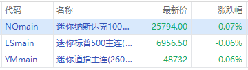 周三盘前,三大股指期货小幅走低,截至发稿,纳指期货 $NQmain 跌0.07%,标普500期货 $ESmain 跌0.06%,道指期货 $YMmain 跌0.06%。