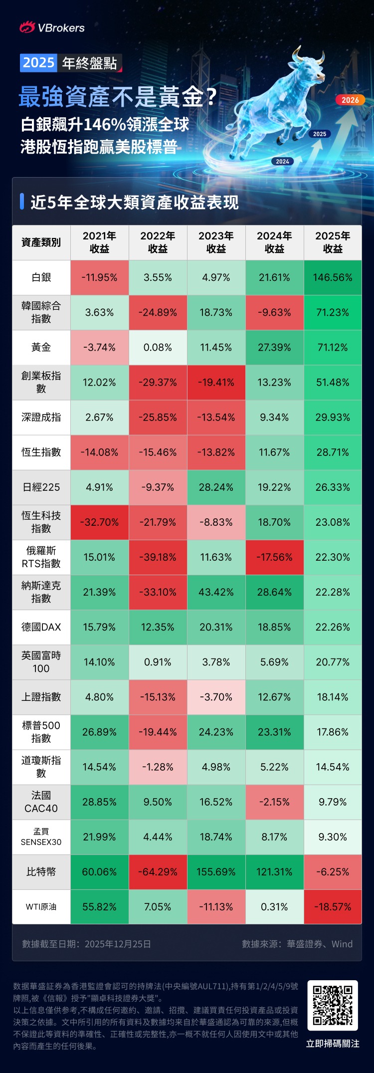 2025 年步入尾声,今年受政治博弈、关税、经济波动与地缘动荡等多重影响,全球大类资产呈现鲜明的多阶段分化特征。其中,过去平平无奇的白银突然爆发,2025年涨超146%一骑绝尘力压黄金,港A日韩亚太市场迎来强劲复苏领涨全球股指,美股延续强势续创新高,比特币上演过山车行情或惨淡收尾,原油则因供需过剩导致价格跌跌不休。