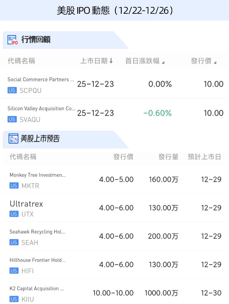 两只新股 $SCPQU $SVAQU 均于23日(本周二)上市,股价较招股价均变动不大。