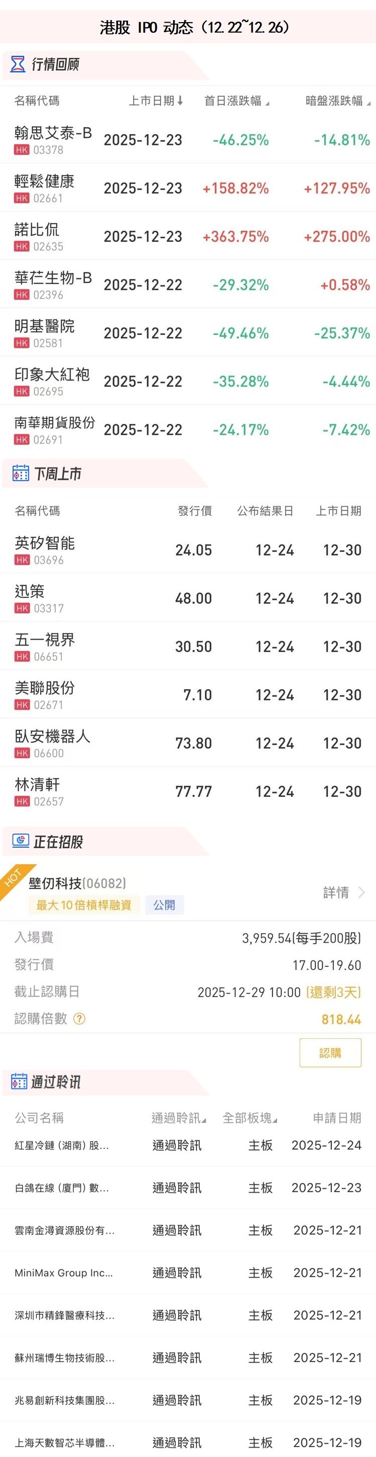 华盛资讯12月26日讯,港股年末上新不断!本周港股有7只新股上市,其中诺比侃、轻松健康上市首日分别暴涨363.75%、158.82%!另还有6只新股已完成招股,将于下周二上市,其中“AI药企”英矽智能及高端国货护肤品牌林清轩双双获逾千倍认购。此外,港股GPU第一股壁仞科技仍在火热招股中。