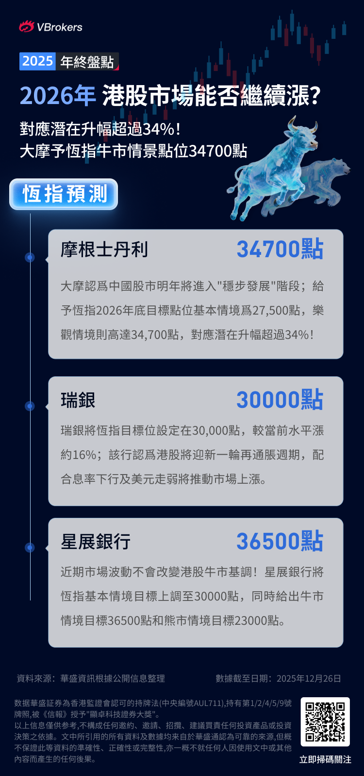 2026年港股市场能否继续走好?目前,多家大行机构对2026年港股市场持乐观态度,普遍认为港股将延续牛市行情,主要基于企业企业盈利改善、流动性宽松、估值修复等多重利好因素。其中,摩根士丹利、星展银行均预计恒指2026年在乐观情景下有望接近35000点水平,对应潜在升幅超过30%。