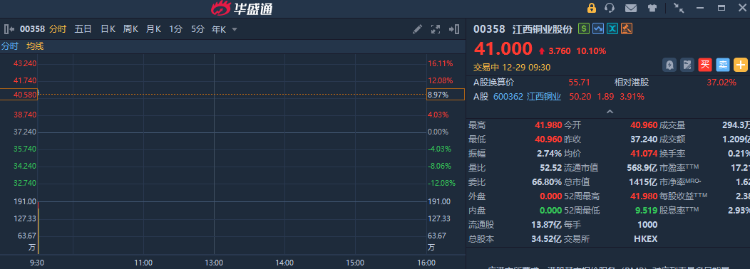 华盛资讯12月29日讯,港股有色金属板块开盘大涨,江西铜业股份涨约10%,此前公司宣布拟收购索尔黄金。