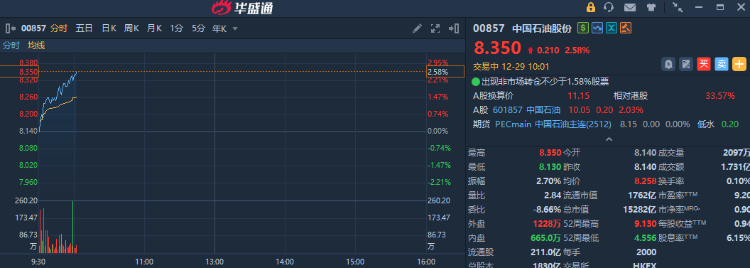华盛资讯12月29日讯,港股油气股盘中上涨,中国石油股份涨超2%,公司旗下新疆油田成我国首个年注碳百万吨油田。