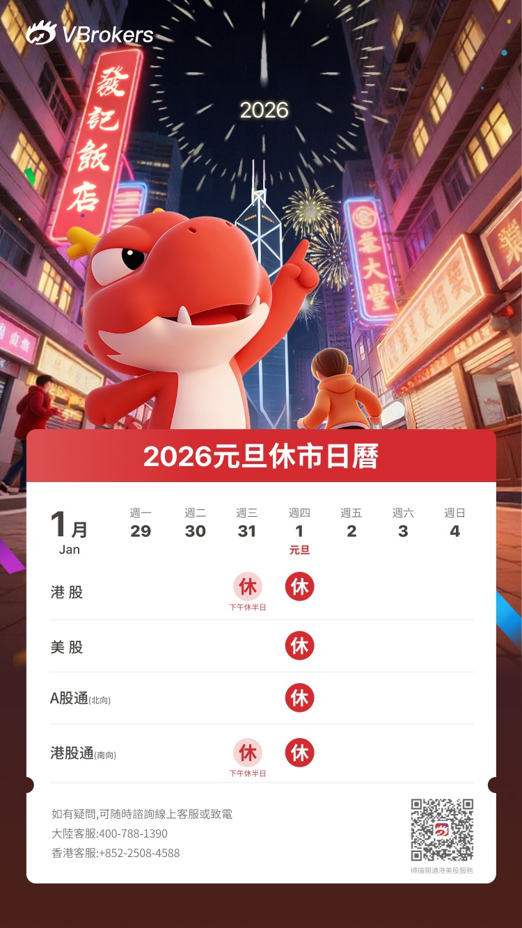 2025年12月31日(星期三)港股将只有半日交易,下午休市。2026年1月1日(星期四)全天休市,1月2日(星期五)起照常开市。