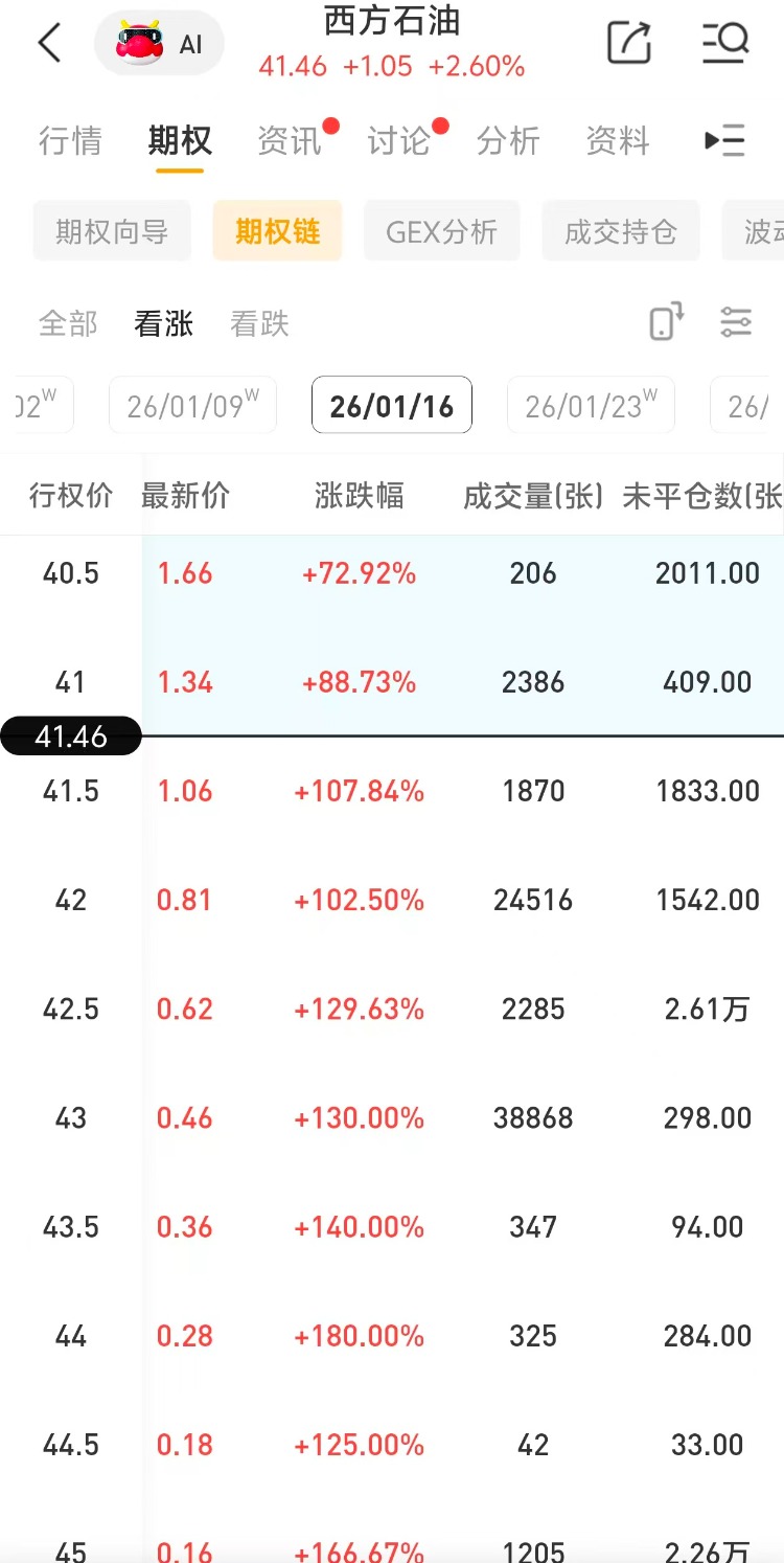 - 一看涨期权(OXY_260116_CALL_43.0 )Vol/OI 比率高达130.43,成交量达3.89万张,未平仓量298张,行权价为43.0美元,行权日在2026-01-16,该张期权涨130.0%。
