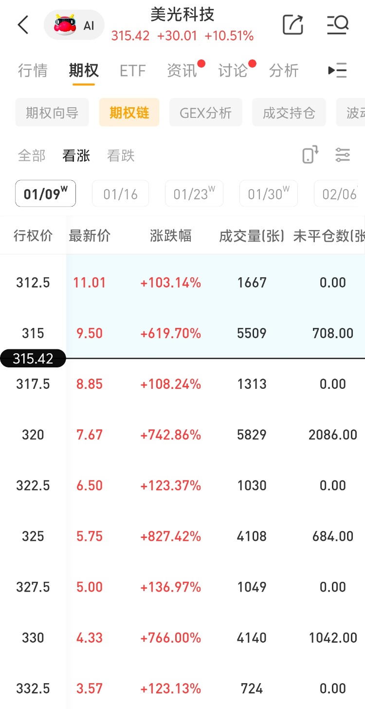 - 消息面上,受全球AI算力需求激增及存储芯片价格强劲反弹推动,美光上周五收涨超10%,股价再创历史新高!多张看涨期权飙升,其中一看涨期权(MU 260109 C 325.00 )交易量达5.75万张,该合约行权价为325美元,行权日在2026-01-09,该张期权涨827.42%。