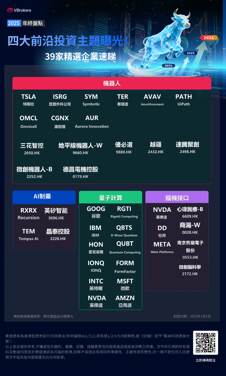 回顾 2025 年,“AI 主题交易”几乎贯穿了港美资本市场的全年主线。2026年,多家大行表示AI将进入应用落地阶段,除了AI眼镜、AI手机,还有哪些前沿科技?又有哪些核心公司值得关注?带你一文看懂。