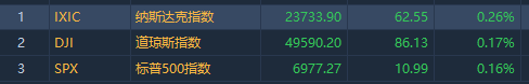 美股三大指数集体小幅收涨,标普500指数和道琼斯指数双双创下历史新高。截至昨日收盘,道指涨86.13点,涨幅为0.17%,报49590.20点;纳指涨62.56点,涨幅为0.26%,报23733.90点;标普500指数涨10.99点,涨幅为0.16%,报6977.27点。