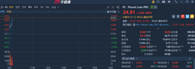 华盛资讯1月12日讯,太空概念股盘初走强,Planet Labs PBC $PL 涨超9%,DXYZ $DXYZ 、回声星通信涨约5%,克瑞托斯安全防卫 $KTOS 涨超4%。