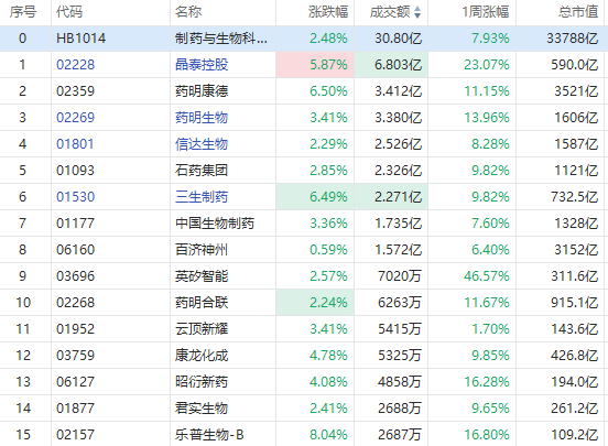 华盛资讯1月12日讯,医药股早盘领涨大市,荣昌生物、乐普生物-B大涨8%,药明康德、三生制药涨超6%,药明生物涨超3%。